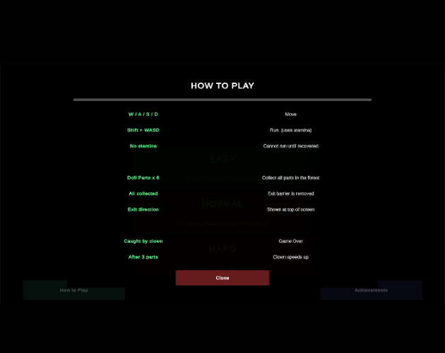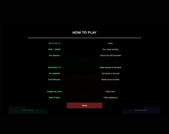 Six cursed doll parts are scattered among the trees. Find them all, locate the exit, and escape — before the White Clown finds you.