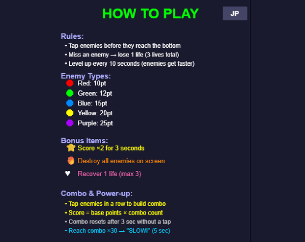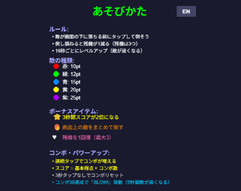 敵が画面から落ちてくる前に、素早くタップして倒すだけのシンプルなゲーム。